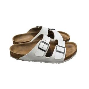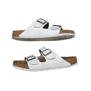 The Birkenstock Arizona Sandals in men's white Birko Flor are a stylish and comfortable slip-on option for casual wear. Made with adjustable straps and a buckle closure, these sandals feature a solid white color with a rubber outsole for durability.