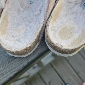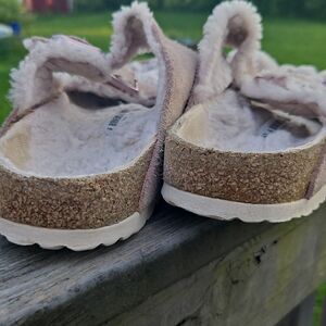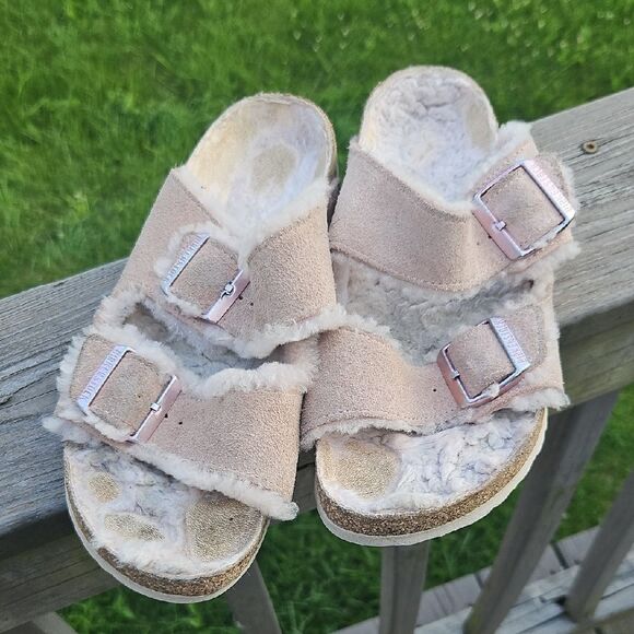 Birkenstock Arizona, shearling sandals, taupe suede, cozy slides, fur lined sandals, cork footbed, adjustable straps, comfy sandals, house shoes