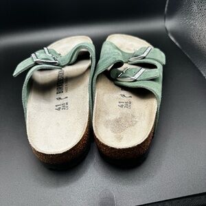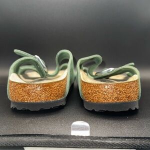 Chic and comfy Birkenstock sandals. Soft green hue. Ideal for daily adventures.