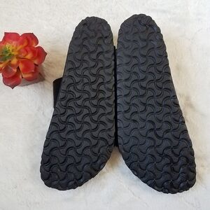 In excellent worn condition, black suede, adjustable double buckle, few minor stains on foot bed, size 43 or size 10.