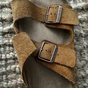 Classic Birkenstock Arizona sandals in soft brown suede, featuring the iconic two-strap design and adjustable metal buckles. This pair offers the well-known Birkenstock comfort with a contoured cork footbed that molds to the shape of your foot over time.