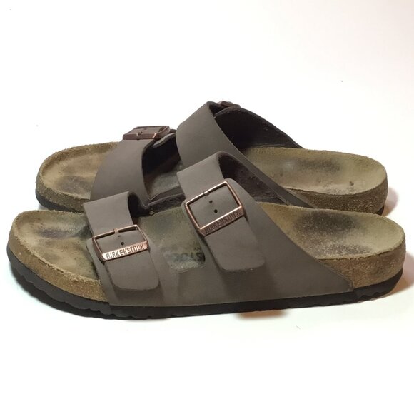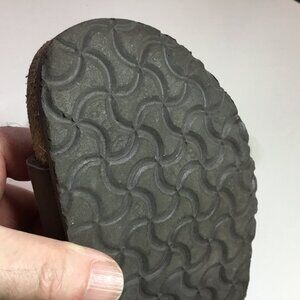 These Birkenstocks are in good used condition. There are signs of wear all around. The footbed has some imprinting. The soles show moderated wear. There are some light scuffs on the straps. Please review all of the photos for condition. This item is cross posted.