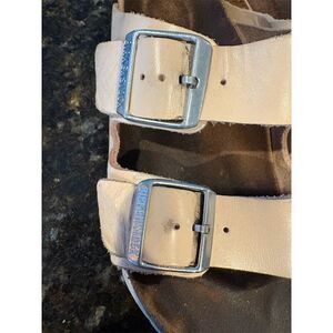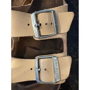 The Birkenstock Arizona slip-on sandals in ivory are crafted from smooth leather, featuring adjustable buckles and the brand's signature footbed for comfort. Designed for women, these sandals are a size 6 US (EU 37) and have a flat heel under 1 inch. The leather insole and lining, along with a rubber outsole, ensure durability. Suitable for casual occasions, these sandals can be worn in all seasons. Made in Germany, they are pre-owned and well-loved, with no major flaws, though the size marking has worn off. Keywords: Birkenstock, Arizona, slip-on, sandals, leather, ivory, casual, adjustable buckles, signature footbed, women's footwear.