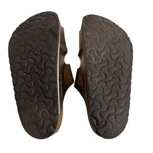 Birkenstock Arizona sandals, bronze faux leather straps, suede footbed, EU 35 / US women's 4 - 4.5, regular - wide width, preowned and shows wear on the soles/heels and footbed, scratches, small tear on the strap - see photos