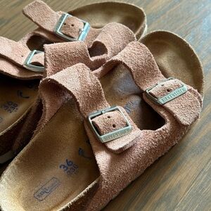 Stylish pink suede sandals with buckle straps. Comfortable and trendy. I don’t wear these often as I have another go to pair. Easy to pack for traveling too as the suede straps are soft. Size 36/5.5 soft footbed
