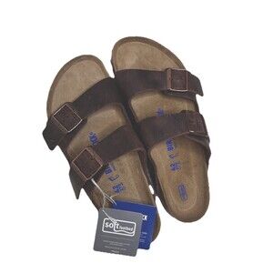 You landed on a brand new pair of Birkenstock Arizona Soft Foot Bed leather habana sandals in mocha brown, oil rubbed leather classic design brass hardware.