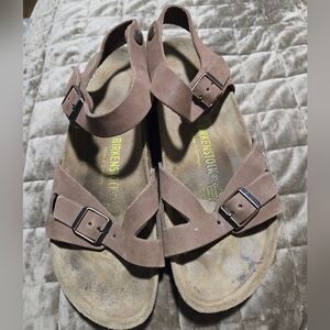 Stylish Birkenstock sandals in tan suede. Features adjustable straps and iconic comfort.