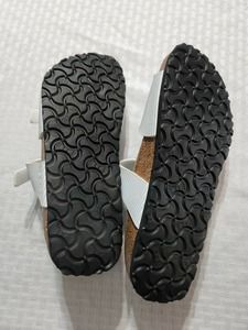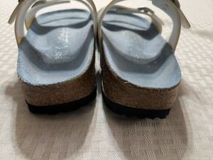 Birkenstock Birki's Womens Sydney Baby Blue & White Striped Sandals US 7 EU 38. These birkis's have the traditional cork bottom with a rubber sole. They are super cute and the buckles are adjustable. The outer material is not leather I believe it to be a vinyl with soft backing that vinly sometimes has. The bottom is also a beautiful light blue feel of suede. These are in like new condition very little wear
