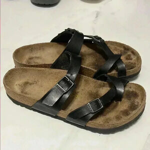 Comfortable Birkenstock sandals. Black straps with adjustable buckles. Perfect for casual wear.