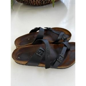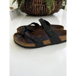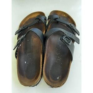 Stylish black Birkenstock sandals. Comfortable cork footbed. Adjustable straps.