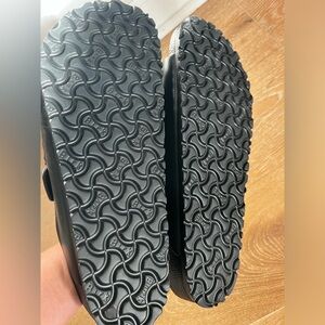 Classic black Birkenstock slides. Features adjustable straps for a custom fit.