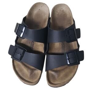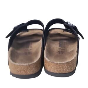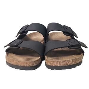 Description: Birkenstock Black Vegan Arizona Sandals, size 41 narrow foot (women's 10 / men's 8), great condition. Features vegan cork-latex footbed for custom molding, adjustable buckles, lightweight EVA outsole, perfect for everyday comfort despite light wear on soles (see photos). Smoke-free home, fast shipping, bundle to save!