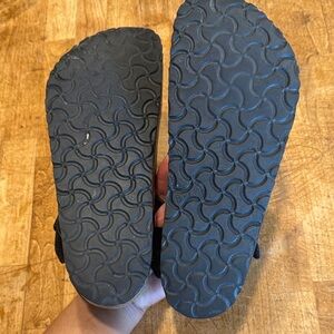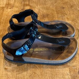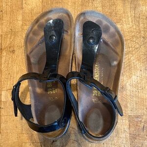 Chic black straps with a comfortable brown footbed. Ideal for everyday wear.