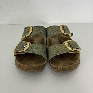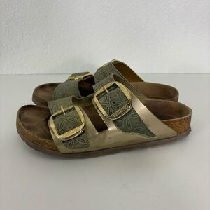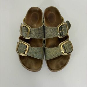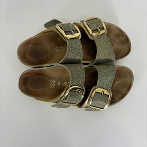 Great pre-owned condition Birkenstock Blue with Gold Floral and Gold Sides Arizona Slide Leather Sandals