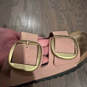 Chic blush Birkenstock sandals with brass buckles. Ideal for everyday comfort.
