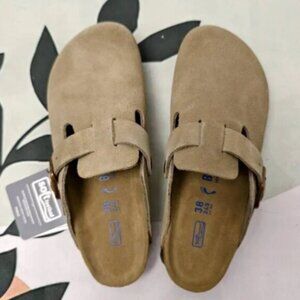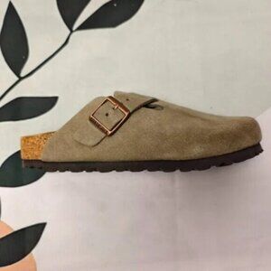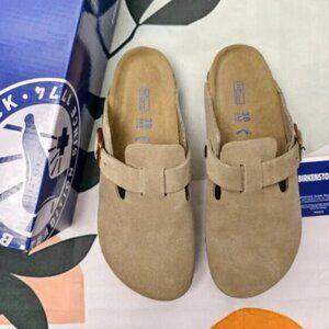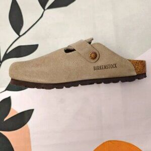 Upgrade your footwear collection with The Birkenstock Boston. Known for its compact design and adjustable buckles, this shoe is crafted from soft cowhide suede for extraordinary comfort. Product details: Color - Taupe, Width - Narrow width (Suitable for Solid Feet), Leather - Cowhide suede, Insole - Soft cork, Sole - Rubber, Shoe shape - Flat profile, Rounded toe, Buckle closure at the top. Our inventory is fully stocked with 100% brand new, high-quality shoes. Contact us for any inquiries.