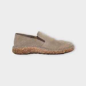 Birkenstock Callan Suede Slip Ons 38 L 7 Taupe Cork Leather EUC Worn 1x