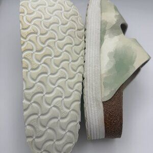 Comfortable Birkenstock sandals with a camouflage design. Features adjustable straps and a supportive footbed.