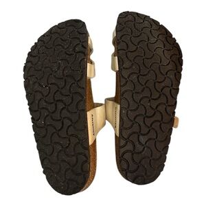 Step into comfort with these Birkenstock sandals, showcasing white straps with adjustable buckles and a contoured brown footbed. The durable brown sole offers reliable support for everyday adventures.