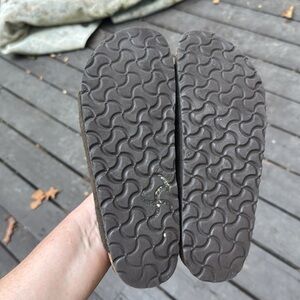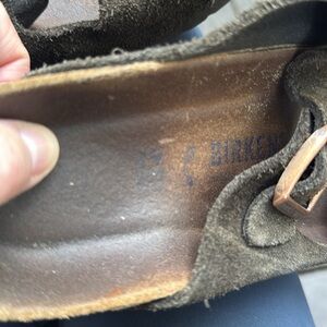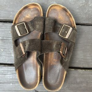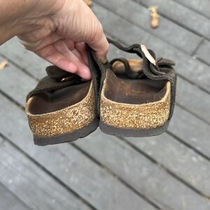Durable Birkenstock sandals. Cork Sole. Dark brown suede with adjustable straps. Ideal for casual outings.
