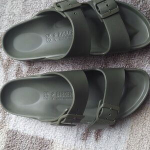 Stylish Birkenstock slides in dark green. Features dual adjustable straps. Will fit a narrow foot. Size 38.