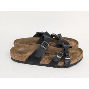 The Birkenstock Franca Sandals in women's size 10 US 41 are a comfortable and stylish slip-on option for casual occasions. Made with leather and featuring a strappy design, these sandals have a flat heel and adjustable buckle strap for a personalized fit. The EVA outsole provides durability, while the cork insole ensures breathability and support. Perfect for summer, these sandals in black are a versatile addition to any woman's shoe collection, showcasing the renowned Birkenstock brand and quality craftsmanship.