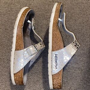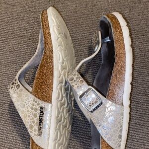Birkenstock Gizah sz 38. Silver animal print, white soles
