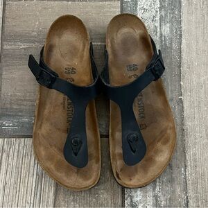 Birkenstock Gizeh Birko-Flor size Women’s 9. Gently used condition. Black upper. The Gizeh brings legendary comfort and elegant detailing to the thong sandal. Birko-Flor® adds a smooth finish to the everyday favorite. Complete with classic BIRKENSTOCK design elements, like a contoured footbed that shapes to you for the ultimate in support.