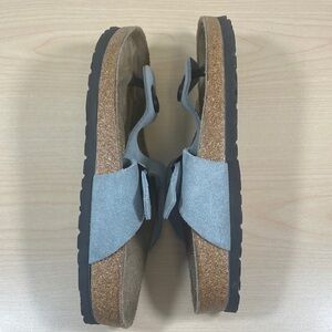 Comfortable light gray suede sandals with cork sole and suede insole. Ideal for everyday wear. Great for many style aesthetics.