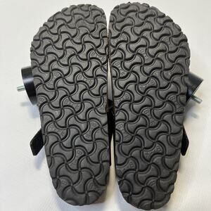 Elevate your summer style with these black Birkenstock Gizeh sandals. Crafted in Germany, these thong sandals feature a flat cork outsole and a comfortable suede insole. The matte black faux leather upper material is accented with a buckle closure and the iconic Birkenstock logo. Perfect for travel, activewear, party/cocktail, or casual occasions, these sandals are a versatile addition to any wardrobe. The straps provide a secure fit while the solid pattern and flat heel style make them a timeless choice. Whether you're hitting the hiking trails or running errands, these Birkenstock Gizeh sandals are the perfect choice for a stylish and comfortable summer look.