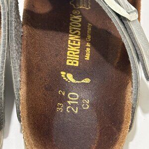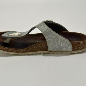 Birkenstock Gizeh Sandal Kids' US 2 - 2.5 - Silver Glitter VERY GOOD CONDITION Manufactorer Details: Keep her warm weather looks looking fun with the Gizeh sandal from Birkenstock. This pair features an anatomically-shaped suede footbed and cushioned cork midsole to keep them comfortable all day long. Not sure which size to order? Click here to check out our Kids’ Measuring Guide! For more helpful tips and sizing FAQs, click here. Item # 499678 UPC # 822698642108 FEATURES PLEASE NOTE: The shoe’s fit is medium width but listed by Birkenstock as Narrow Fit or Regular Fit on the item box. Microfiber fabric upper Slip-on Round open toe Synthetic lining Contoured suede footbed Cork midsole EVA sole Made in Germany Stock Photos: #2 Condition: Pre-Owned - In VERY GOOD condition - Small stain on bottom of shoe that does not effect the wear. I ship Monday and Friday.