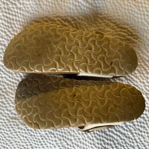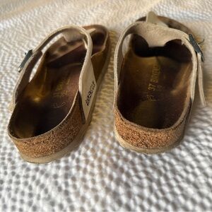 Stylish Birkenstock sandals in cream. Features a comfortable brown footbed. Ideal for everyday wear.