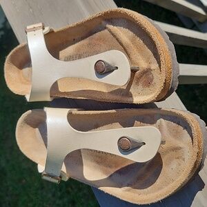 Classic Birkenstock Gizeh thong sandals in a versatile cream color. Straps have a sheen to them but aren't quite metallic.Features the iconic open footprint footbed (narrow/medium width) with contoured cork-latex support, deep heel cup, and raised toe bar for all-day comfort. Adjustable strap with signature Birkenstock metal buckle.