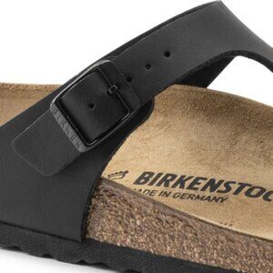 Birkenstock takes pride in creating a product with deep roots in European craftmanship and environmental responsibility in mind. The brand uses high quality materials to produce footwear that is not only beautiful, but offer comfort and support. *True to size* The Gizeh sandal by Birkenstock is a classic with a modern twist. This thong is made of wear friendly Birko-Flor uppers in a leather-like finish. The arch support footbed features an anatomically shape with a suede lined cork-latex, and an EVA, lightweight, shock absorption outsole.