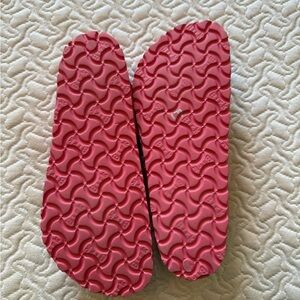 Experience comfort with Birkenstock's vibrant coral sandals. Ideal for everyday wear.