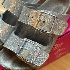 These were my daughter’s shoes. They are in good condition. Please see pictures - there are scratches on the buckles from her sitting cross-legged on the sidewalk. They also have faint marks.