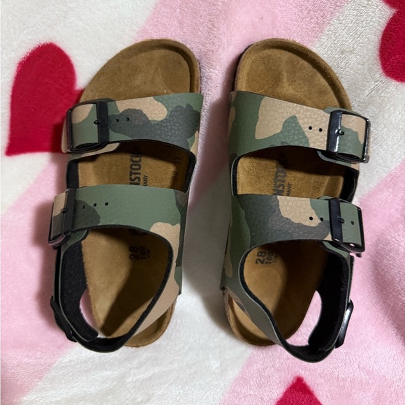 Stylish Birkenstock kids sandals. Features a camo khaki design. Comfortable and durable.