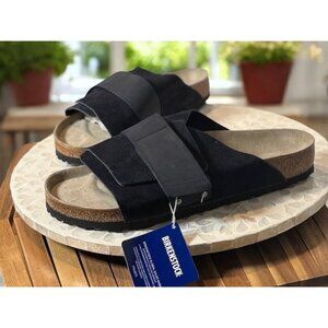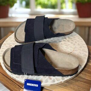 Birkenstock Kyoto, navy Birkenstock sandals, suede Birkenstock slides, velcro strap sandals, cork footbed slides, Birkenstock men’s 9, Birkenstock women’s 10, unisex comfort sandals, minimalist sandals, orthopedic footbed, made in Germany