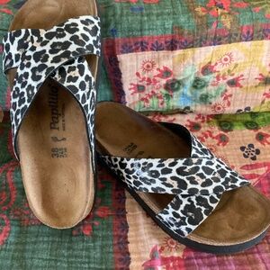 Stylish Birkenstock sandals with leopard print straps. Comfortable cork footbed. Perfect for casual wear.