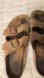 Classic Birkenstock sandals in light brown suede. Features dual adjustable straps. Please see pictures video reflects marks on both sides of sandals- still have a lot of life in them, but do have wear please see pictures and video