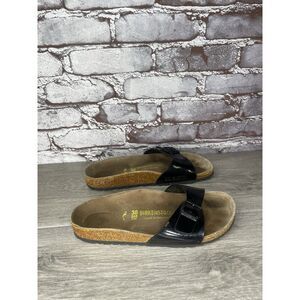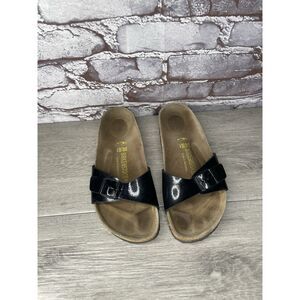 Selling Birkenstock Madrid Black Patent Leather Cork Slides Sandals Women’s Sz 38EU/7.5M US