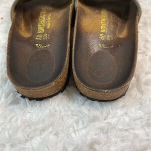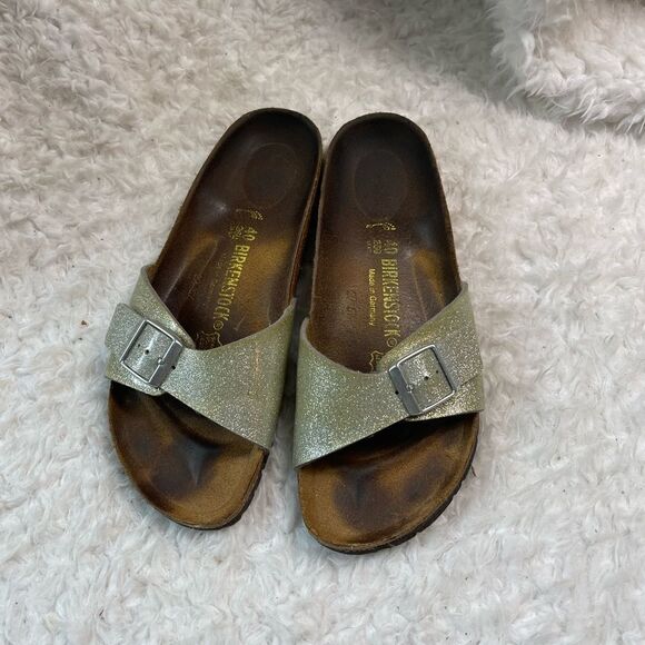 Birkenstock Madrid Matte Metallic glitter silver and Gold silver buckle EUR SZ40 pre owned in good used condition signs of wear on the inner soles see all pictures any questions please message.