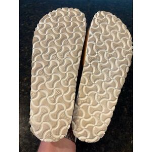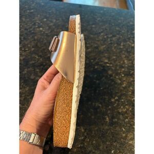 Keywords: Birkenstock, Madrid, slip-on, sandals, rose gold, women's footwear, casual, summer, adjustable strap, iconic footbed, Birko-Flor, flat heel, Germany, pre-owned, light wear.