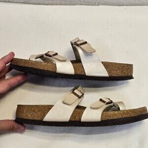 Birkenstock Mayari Birko-Flor Sandals Womens 8-8.5 EU 39 White Adjustable Strap Mens 6-6.5 Cork Footbed. Comfort, Minimalist, Casual, Adjustable, Vegan, Summer, Strappy, Birko-Flor, Cork Footbed, Travel.