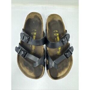 Experience ultimate comfort with these Birkenstock Mayari black leather sandals. The strappy design and adjustable buckle closure make them perfect for any casual occasion or travel adventure. The flat heel and cork outsole provide all-day comfort, while the breathable lining and leather insole add to the overall comfort of the shoe. These sandals feature a solid pattern and are accented with a strap for added style. The Birkenstock Mayari model is a classic and durable option, perfect for any outdoor enthusiast. Available in US shoe size 5/5.5 and UK shoe size 3, these sandals are a must-have for any woman's shoe collection.
