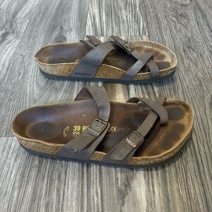 Supremely comfortable with sophisticated, crisscross straps, the Mayari redefines the thong sandal with a single toe loop. The style comes in smooth Birkibuc® for a brushed, nubuck-like finish. Complete with classic BIRKENSTOCK design elements, like adjustable buckle closures and a contoured footbed for the ultimate in support.