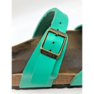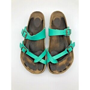 The product is a pair of Birkenstock Mayari sandals in EU size 39, featuring teal straps. These slip-on sandals offer low heel height and arch support, making them comfortable for all-day wear. The breathable design with adjustable straps and a buckle closure is perfect for summer, fall, and spring occasions like travel, parties, or casual outings. Made with leather and a cork outsole, these sandals are durable and stylish for a beach look or a classic bohemian vibe.