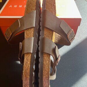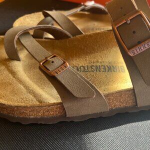 Mocha color Birkenstock Mayari sandals, Size 42. Supremely comfortable with sophisticated, crisscross straps, the Mayari redefines the thong sandal with a single toe loop. The style comes in smooth Birkibuc for a brushed, nubuck-like finish. Complete with classic Birkenstock design elements, like adjustable buckle closures and a contoured footbed for the ultimate in support. Contoured cork-latex footbed creates custom support with wear, synthetic leather upper, suede footbed lining, lightweight EV sole, and two straps made with adjustable metal pin buckles. Shoes have only been tried on, never worn. Item will not come in original box. Please make sure you are certain of your size before purchasing. MSRP on Birkenstock website: $112.95