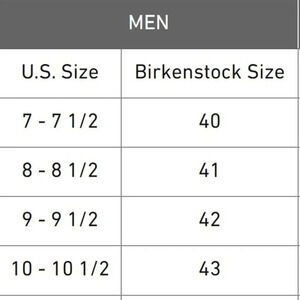 Size: EU 40, Mens US 7-7.5. women's US 9- Size conversion found at https://www.birkenstock.com/us/us-service-fittingguide.html