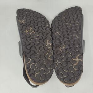 * Shows wear with visible footbed discoloration and imprinting, creasing and light scuffing on leather straps, patina on buckles, and outsole tread wear with life remaining. No rips or structural damage observed.